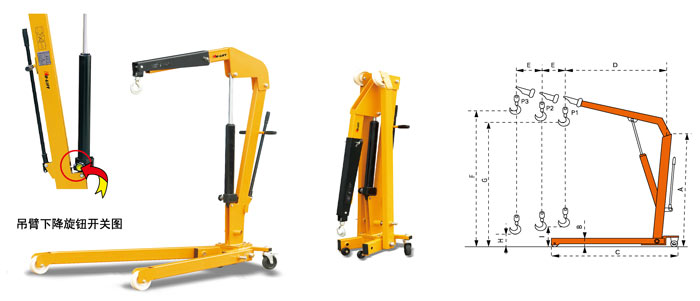 ● 重載設計,高品質(zhì)的快起升油缸,省時省力 ● 根據(jù)需要.吊臂可三個工位調(diào)節(jié) ● 鍛造重載可旋轉(zhuǎn)吊鉤 ● 出廠前125%過載測試,保證安全使用 ● 符合歐洲CE安全標準